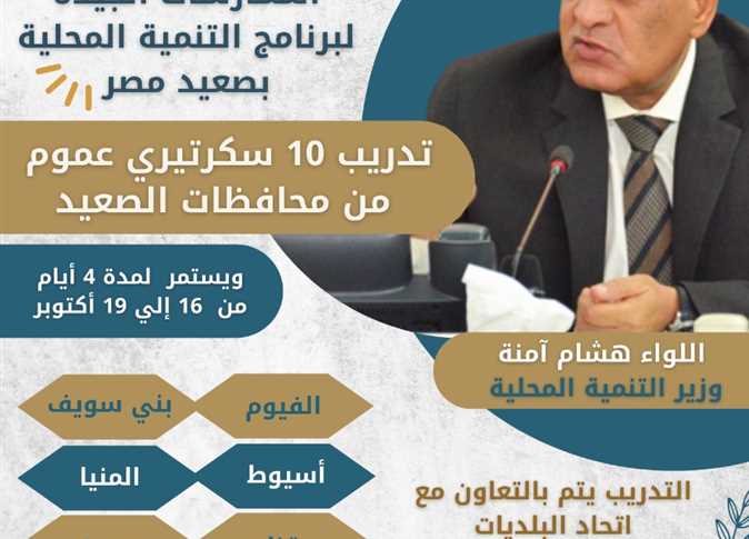 قال اللواء هشام آمنة، وزير التنمية المحلية، إن الهدف من تدريب سكرتيرى عموم محافظات الصعيد، تعميم الممارسات الجيدة المطبقة في برنامج التنمية المحلية بصعيد مصر، حيث يشارك في البرنامج 10 من سكرتيرى العموم بمحافظات بني سويف والفيوم والمنيا وأسيوط وسوه...